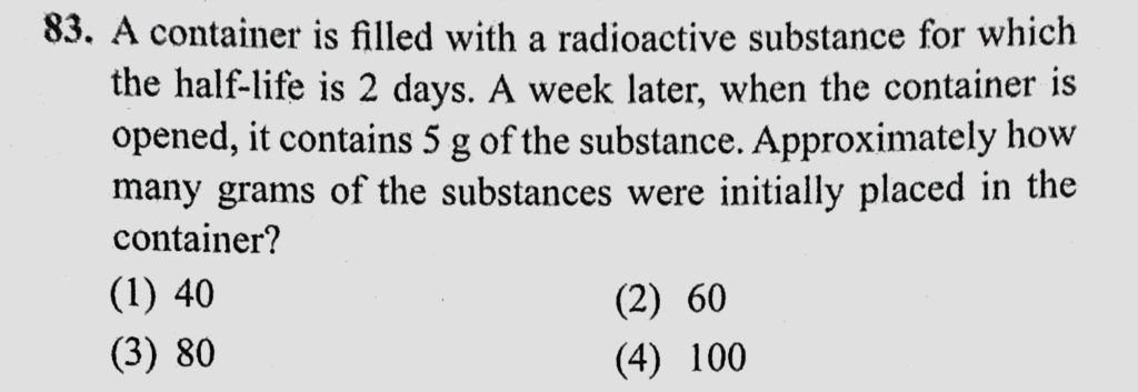 A container is filled with a radioactive substance for which the half-life is 2 days. A week later, when the container is opened, it contains 5 g of the substance. Approximately how many A container is filled with a radioactive substance for which the half-life is 2 days. A week later it contains 5 g of the substance. Approximately how many when the container is opened October 18, 2020 Category: Uncategorised (JEE Advanced Physics by BM Sharma + GMP Solutions) , Facebook Messenger WhatsApp Share this:TwitterFacebook Related