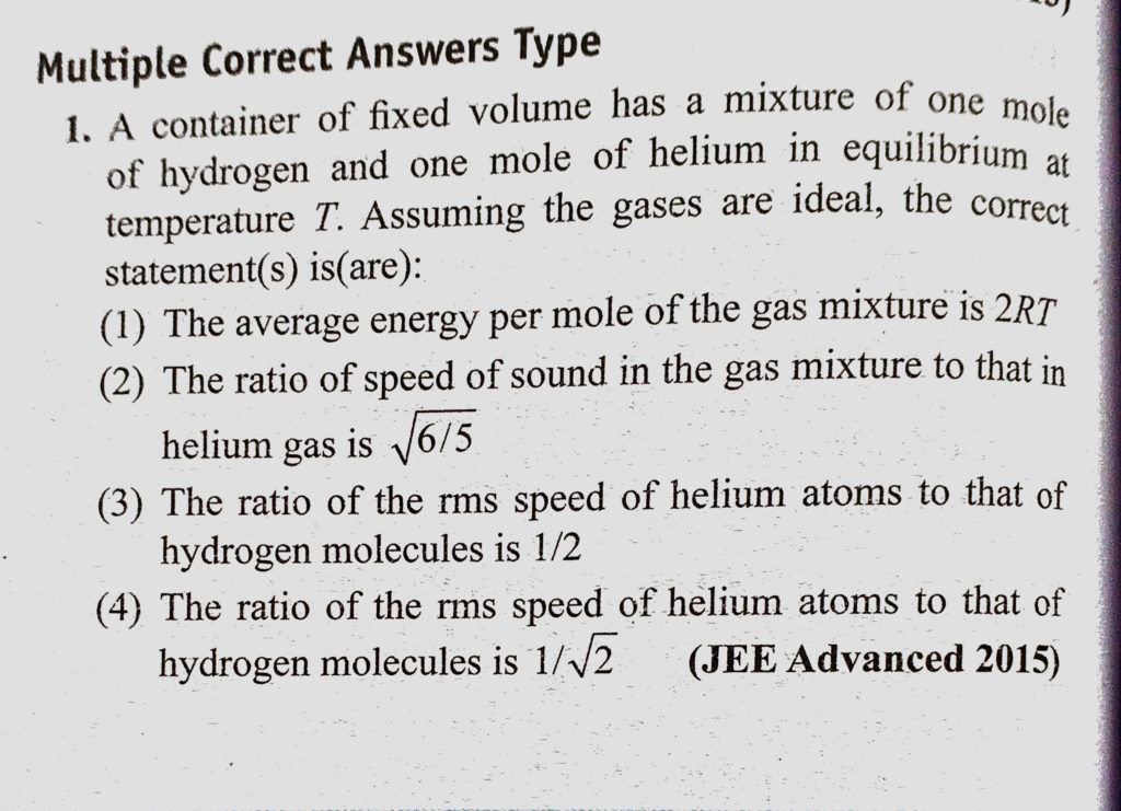 A container of fixed volume has a mixture of one mole of hydrogen and one mole of helium in equilibrium at temperature T. Assuming the gases are ideal , the correct statement(s) A container of fixed volume has a mixture of one mole of hydrogen and one mole of helium in equilibrium at temperature T. Assuming the gases are ideal the correct statement(s) October 28, 2020 Category: Uncategorised (JEE Advanced Physics by BM Sharma + GMP Solutions) , Facebook Messenger WhatsApp Share this:TwitterFacebook Related