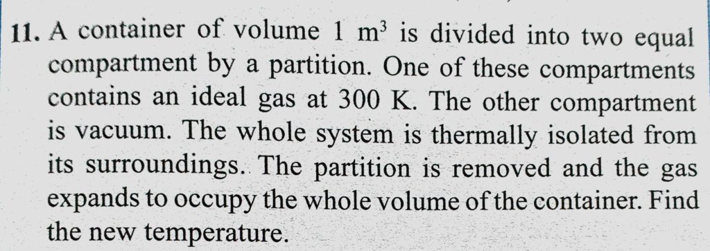 A container of volume 1 m^3 is divided into two equal compartment by a partition. One of these compartments contains an ideal gas at 300 K. The other compartment is vacuum. A container of volume 1 m^3 is divided into two equal compartment by a partition. One of these compartments contains an ideal gas at 300 K. The other compartment is vacuum. October 28, 2020 Category: Uncategorised (JEE Advanced Physics by BM Sharma + GMP Solutions) , Facebook Messenger WhatsApp Share this:TwitterFacebook Related
