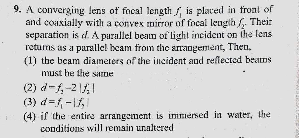 A converging lens of focal length f1 is placed in front of and coaxially with a convex mirror of focal length f2. Their separation is d. A parallel beam of light incident on the lens A converging lens of focal length f1 is placed in front of and coaxially with a convex mirror of focal length f2. Their separation is d. A parallel beam of light incident on the lens October 9, 2020 Category: Uncategorised (JEE Advanced Physics by BM Sharma + GMP Solutions) , Facebook Messenger WhatsApp Share this:TwitterFacebook Related
