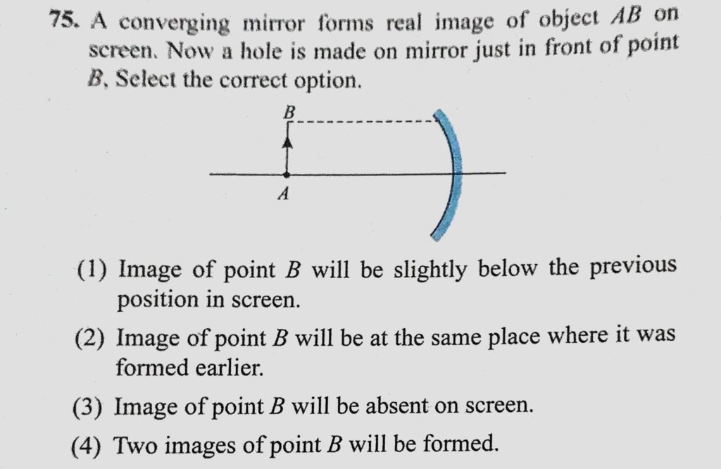 A converging mirror forms real image of object AB on screen. Now a hole is made on mirror just in front of point B, select the correct option. A converging mirror forms real image of object AB on screen. Now a hole is made on mirror just in front of point B select the correct option. October 6, 2020 Category: Uncategorised (JEE Advanced Physics by BM Sharma + GMP Solutions) , Facebook Messenger WhatsApp Share this:TwitterFacebook Related