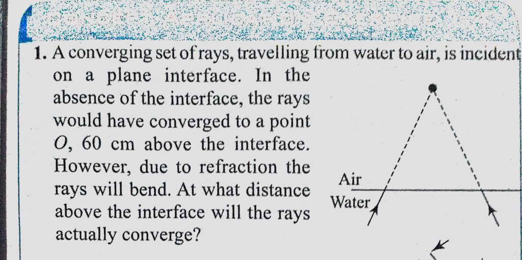 A converging set of rays, travelling from water to air, is incident on a plane interface, the rays would have converged to a point O. 60 cm above the interface. However, due to refraction the rays will bend. A converging set of rays due to refraction the rays will bend. is incident on a plane interface the rays would have converged to a point O. 60 cm above the interface. However travelling from water to air October 5, 2020 Category: Uncategorised (JEE Advanced Physics by BM Sharma + GMP Solutions) , Facebook Messenger WhatsApp Share this:TwitterFacebook Related