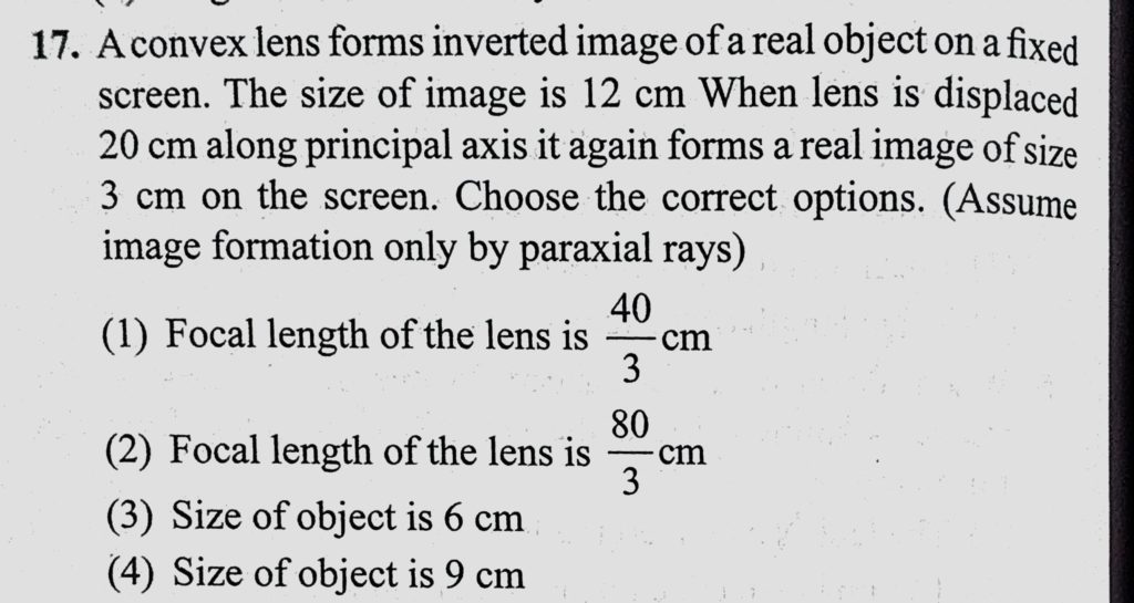 A convex lens forms inverted image of a real object on a fixed screen. The size of image is 12 cm When lens is displaced 20 cm along principal axis it again forms a real image of size A convex lens forms inverted image of a real object on a fixed screen. The size of image is 12 cm When lens is displaced 20 cm along principal axis it again forms a real image of size October 9, 2020 Category: Uncategorised (JEE Advanced Physics by BM Sharma + GMP Solutions) , Facebook Messenger WhatsApp Share this:TwitterFacebook Related