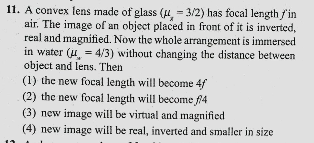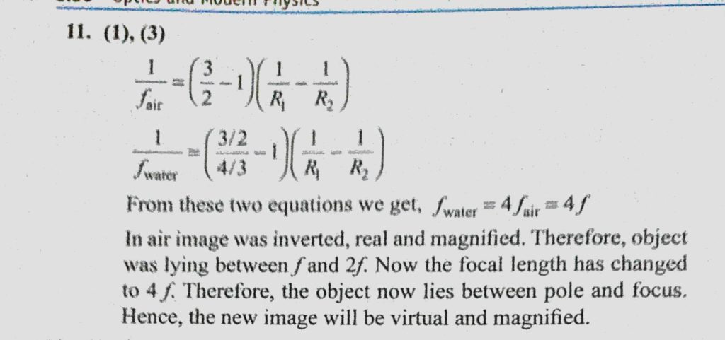 A convex lens made of glass (mu g = 3/2) has focal length f in air. The image of an object placed in front of it is inverted, real and magnified. Now the whole arrangement is immersed A convex lens made of glass (mu g = 3/2) has focal length f in air. The image of an object placed in front of it is inverted real and magnified. Now the whole arrangement is immersed October 9, 2020 Category: Uncategorised (JEE Advanced Physics by BM Sharma + GMP Solutions) , Facebook Messenger WhatsApp Share this:TwitterFacebook Related
