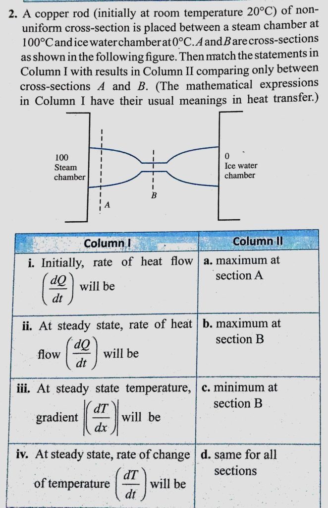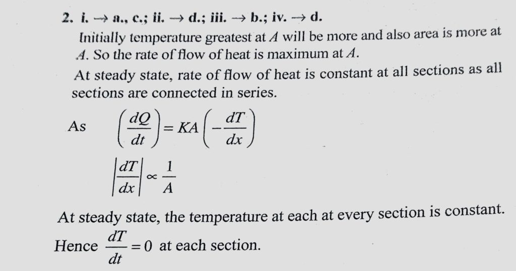 A copper rod (initially at room temperature 20 C) of non-uniform cross-section is placed between a steam chamber at 100 C and ice water chamber at 0 C. A and B are cross sections A copper rod (initially at room temperature 20 C) of non-uniform cross-section is placed between a steam chamber at 100 C and ice water chamber at 0 C. A and B are cross sections October 25, 2020 Category: Uncategorised (JEE Advanced Physics by BM Sharma + GMP Solutions) , Facebook Messenger WhatsApp Share this:TwitterFacebook Related