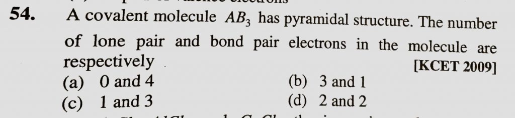 A covalent molecule AB3 has pyramidal structure. The number of lone pair and bond pair electrons in the molecule are respectively A covalent molecule AB3 has pyramidal structure. The number of lone pair and bond pair electrons in the molecule are respectively December 7, 2020 Category: Uncategorised (JEE Advanced Physics by BM Sharma + GMP Solutions) , Facebook Messenger WhatsApp Share this:TwitterFacebook Related