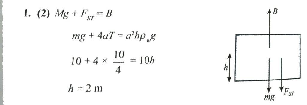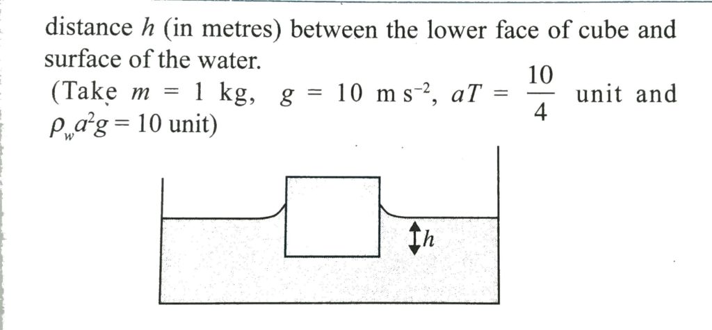 A cube of side a and mass m just floats on the surface of water as shown in the figure. The surface tension and density of water are T and ρ w , respectively. If angle of contact between cube and water surface is zero, find the distance h (in metres) between the lower face of cube and surface of the water. (Take m =1 kg, g = 10 m/s 2 ,aT = 4 10 unit and ρ w a 2 g = 10 unit).