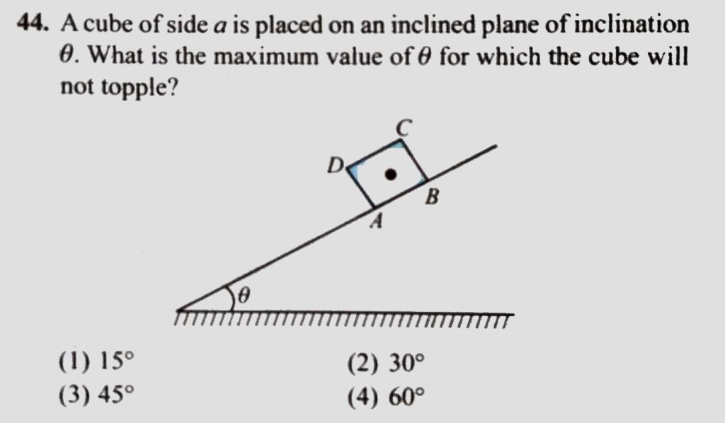 A cube of side a is placed on an inclined plane of inclination theta. What is the maximum value of theta for which the cube will not topple? A cube of side a is placed on an inclined plane of inclination theta. What is the maximum value of theta for which the cube will not topple? September 26, 2020 Category: Uncategorised (JEE Advanced Physics by BM Sharma + GMP Solutions) , Facebook Messenger WhatsApp Share this:TwitterFacebook Related