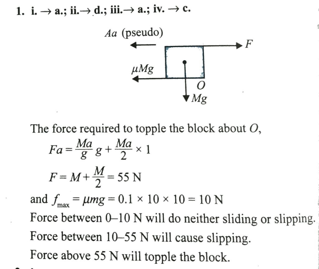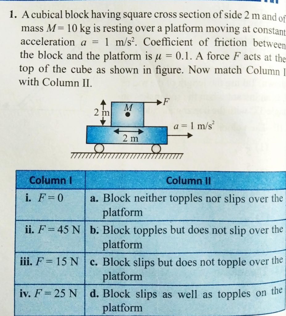 A cubical block having square cross section of side 2 m and of mass M = 10 kg is resting over a platform moving at constant acceleration a = 1 m/s^2. Coeffient of friction between the block and platform is mu = 0.1. A force F acts at the the top of the cube as shown in figure. Now match Column I with Column II.