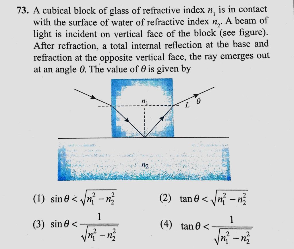 A cubical block of glass of refractive index n1 is in contact with the surface of water of refractive index n2. A beam of light is incident on vertical face of the block (see figure). A cubical block of glass of refractive index n1 is in contact with the surface of water of refractive index n2. A beam of light is incident on vertical face of the block (see figure). October 6, 2020 Category: Uncategorised (JEE Advanced Physics by BM Sharma + GMP Solutions) , Facebook Messenger WhatsApp Share this:TwitterFacebook Related