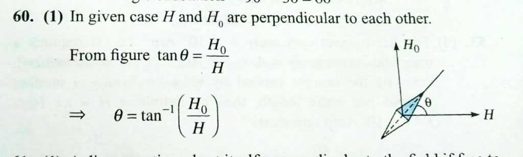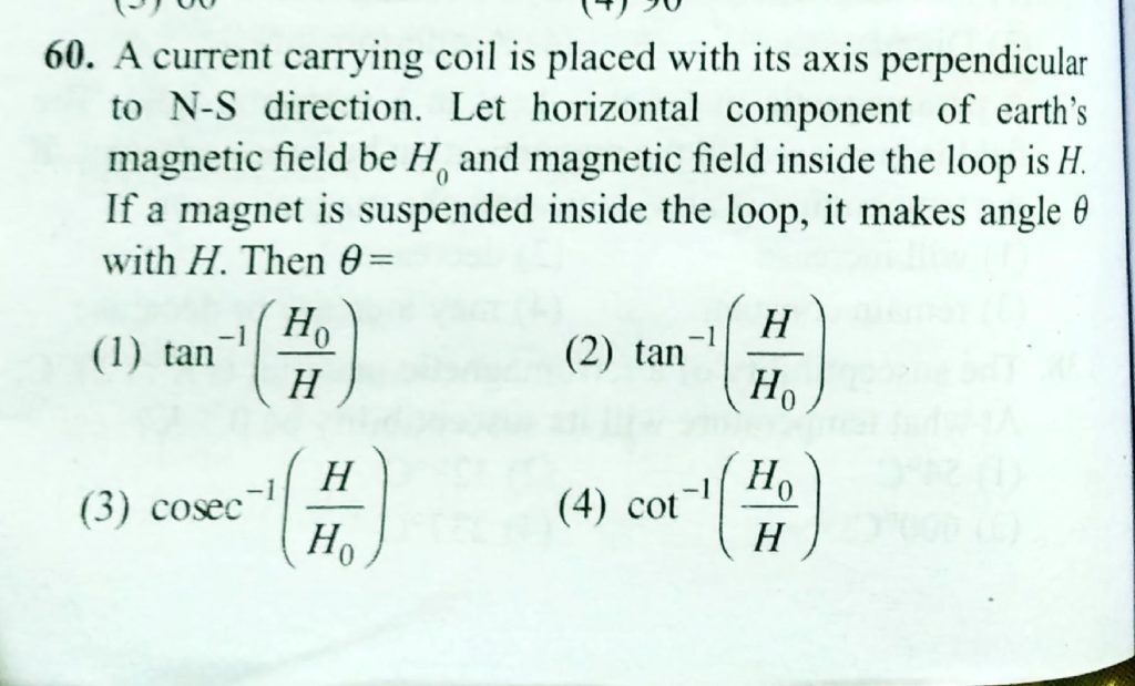 A current carryingcoil is placed with its axis perpendicular to N-S direction. Let horizontal component of earth’s magnetic field be H0 and magnetic field inside the loop is H. If a magnet is suspended inside the loop, it makes angle θ with H. Then θ=