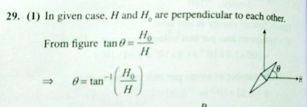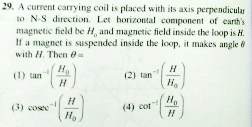 A current carryingcoil is placed with its axis perpendicular to N-S direction. Let horizontal component of earth’s magnetic field be H0 and magnetic field inside the loop is H. If a magnet is suspended inside the loop, it makes angle θ with H. Then θ=