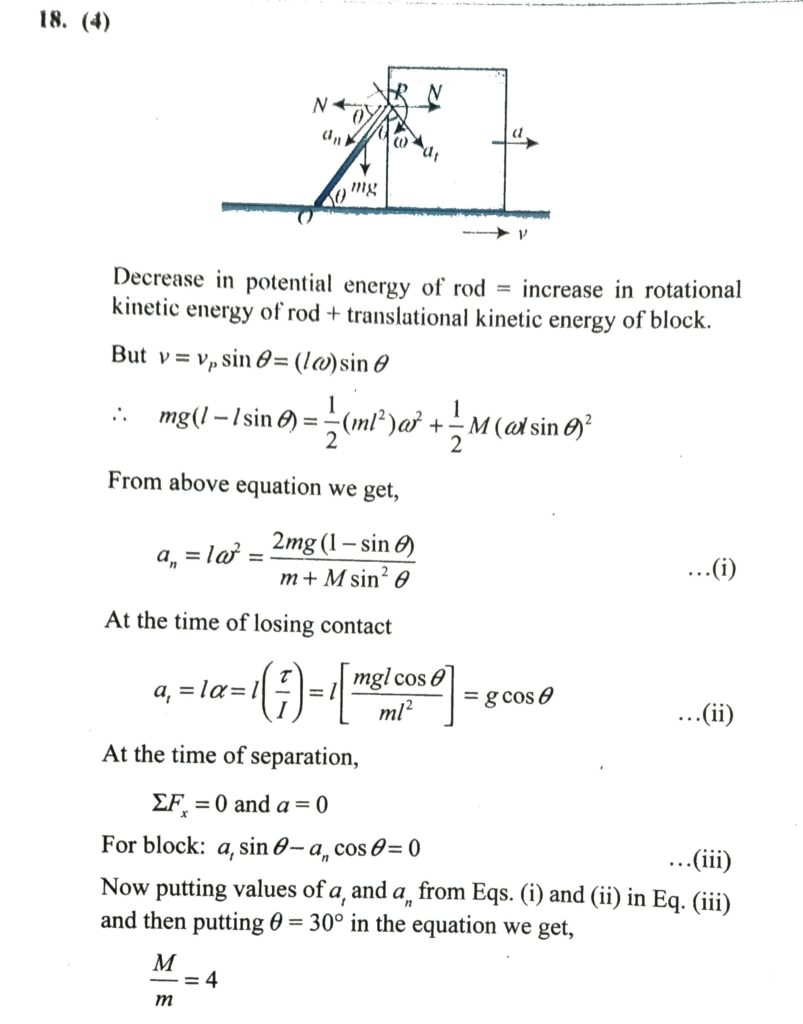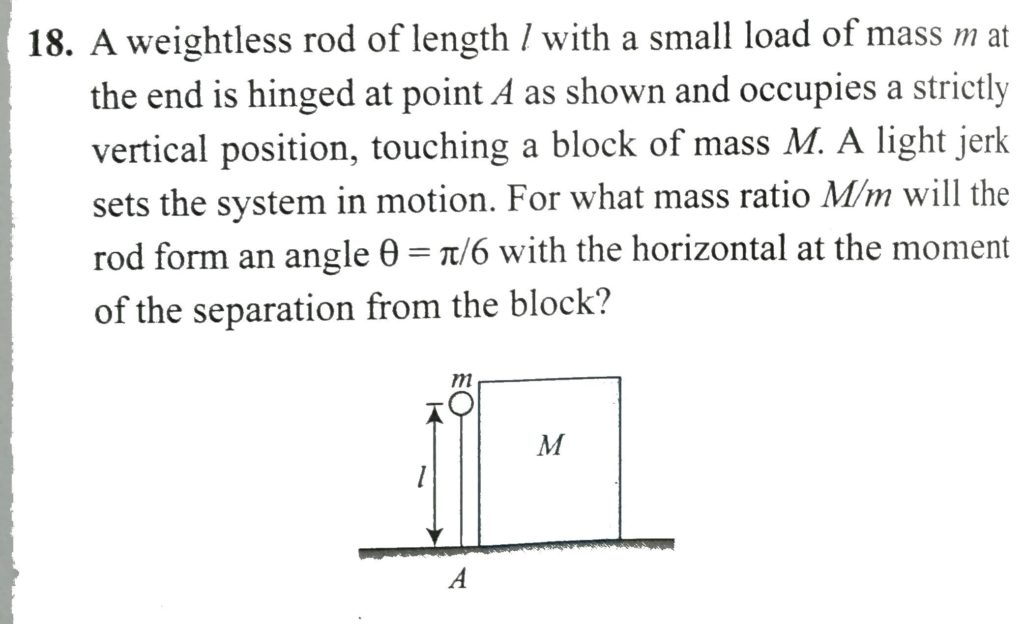 A weightless rod of length l with a small load of mass m at the end is hinged at point A as shown and occupies a strictly vertical position, touching a body of mass M. A light jerk sets the system in motion. a. For what mass ratio M/m will the rod form an angle α=π/6 with the horizontal at the moment of the separation from the block?