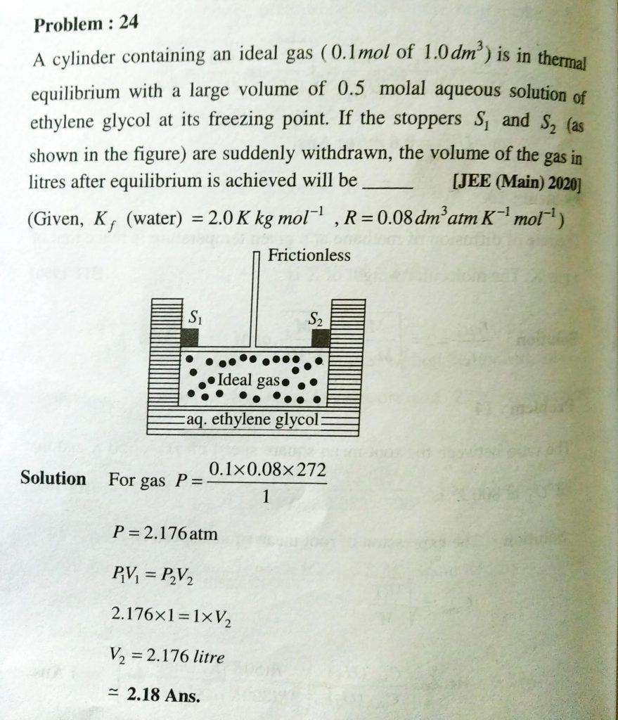 A cylinder containing an ideal gas (0.1 mol of 1.0 dm ^3 ) is in thermal equilibrium with a large volume of 0.5 molal aqueous solution of ethylene glycol at its freezing point. If the stoppers S 1 and S 2 ( as shown in the figure) are suddenly withdrawn , the volume of the gas in litres after equilibrium is achieved will be ________.