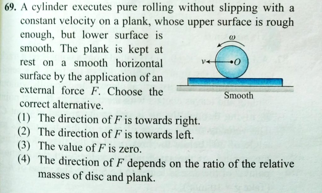 A cylinder executes pure rolling without slipping with a constant velocity on a plank, whose upper surface is rough enough, but lower surface is smooth. The plank is kept at rest on a smooth horizontal surface by the application of an external force F. Choose the correct alternative: