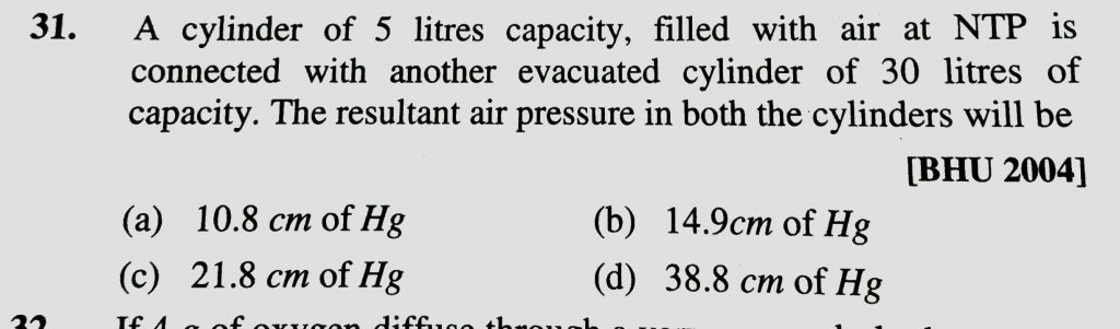 A cylinder of 5 litres capacity , filled with air at NTP is connrected with another evacuated cylinder of 30 litres of capacity . THe resultant air pressure in both the cylinders will be A cylinder of 5 litres capacity filled with air at NTP is connrected with another evacuated cylinder of 30 litres of capacity . THe resultant air pressure in both the cylinders will be February 10, 2021 Category: Uncategorised (JEE Advanced Physics by BM Sharma + GMP Solutions) , Facebook Messenger WhatsApp Share this:TwitterFacebook Related