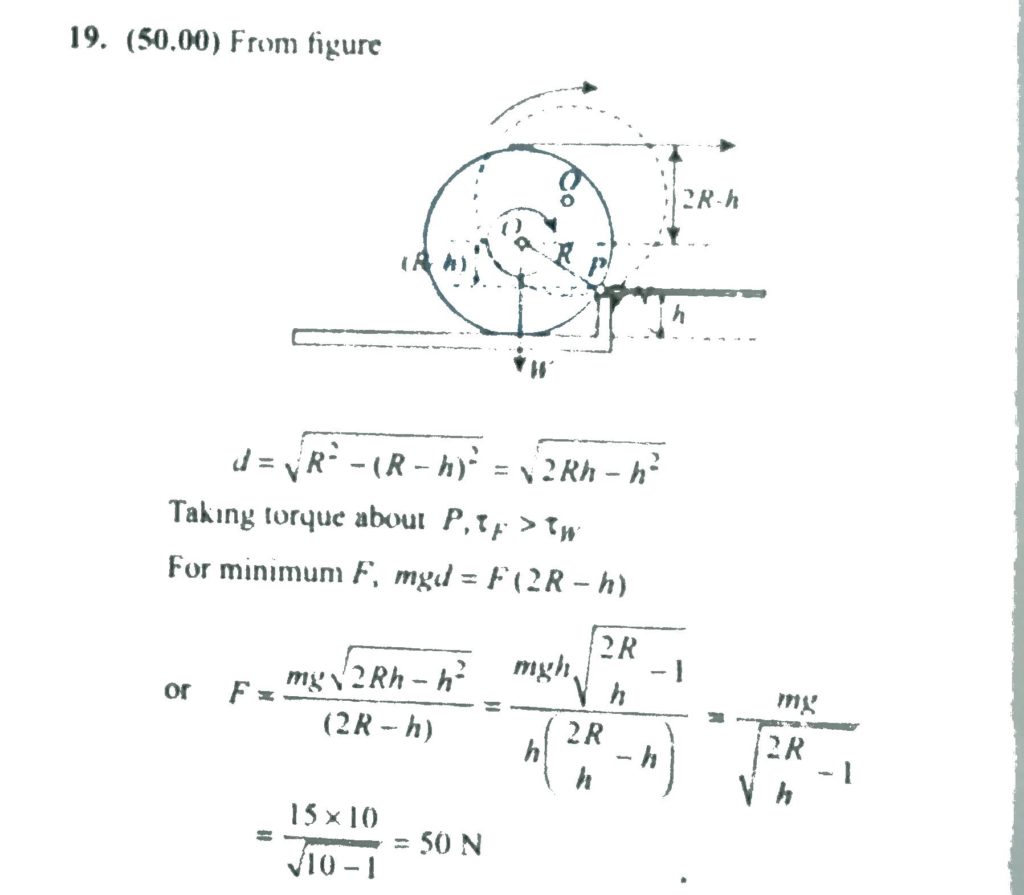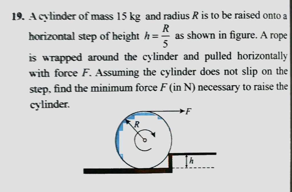 A cylinder of mass 15 kg and radius R is to be raised onto a horizontal step of height h = R/5 as shown. A rope is wrapped around the cylinder and pulled horizontally. Assuming no slipping, find the minimum value of F to raise the cylinder. A cylinder of mass 15 kg and radius R is to be raised onto a horizontal step of height h = R/5 as shown. A rope is wrapped around the cylinder and pulled horizontally. Assuming no slipping find the minimum value of F to raise the cylinder. September 28, 2020 Category: Uncategorised (JEE Advanced Physics by BM Sharma + GMP Solutions) , Facebook Messenger WhatsApp Share this:TwitterFacebook Related
