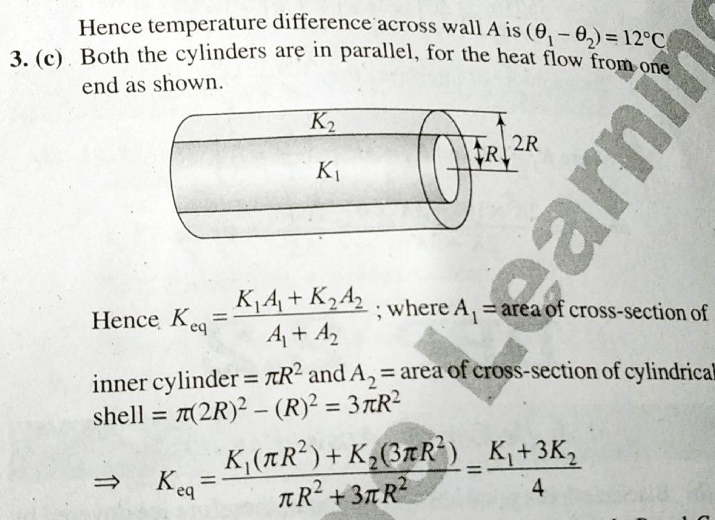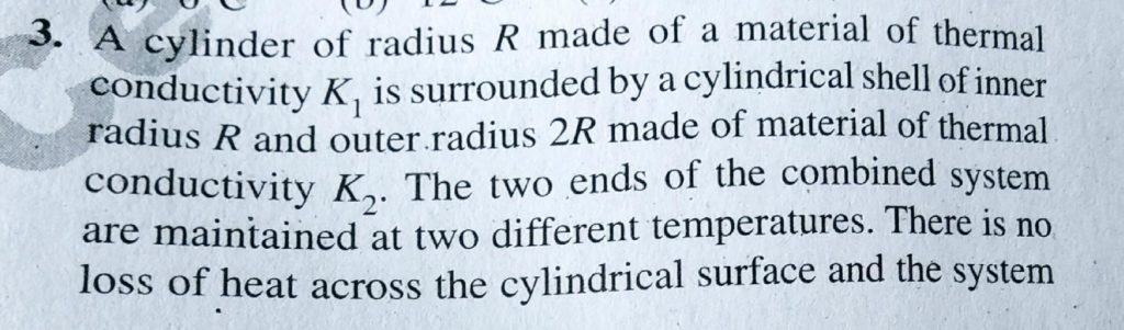 A cylinder of radius R made of a material of thermal conductivity K1 is surrounded by a cylindrical shell of inner radius R and outer radius 2R made of a material of thermal conductivity K2. The two ends of the combined system are maintained at two different temperatures. There is no loss of heat across the cylindrical surface and the system is in steady state. The effective thermal conductivity of the system is