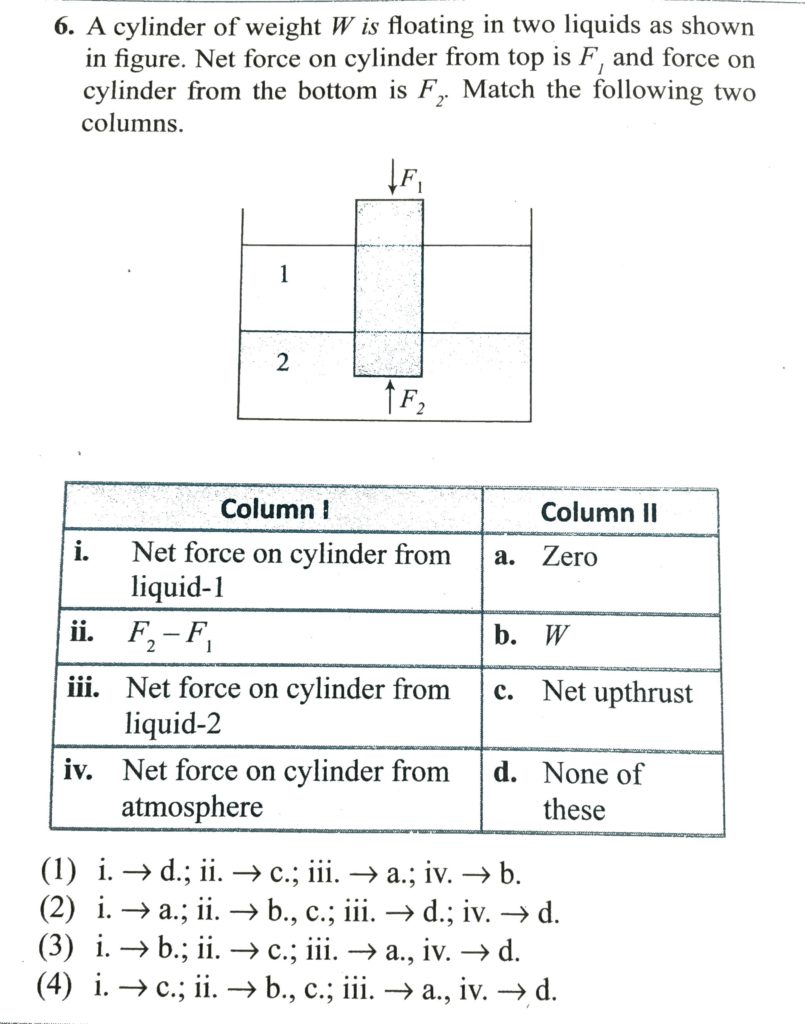 A cylinder of weight W is floating in two liquids as shown in figure. Net force on cylinder from top is F1 and force on cylinder from the bottom is F2. Match the following two columns A cylinder of weight W is floating in two liquids as shown in figure. Net force on cylinder from top is F1 and force on cylinder from the bottom is F2. Match the following two columns October 8, 2020 Category: Uncategorised (JEE Advanced Physics by BM Sharma + GMP Solutions) , Facebook Messenger WhatsApp Share this:TwitterFacebook Related