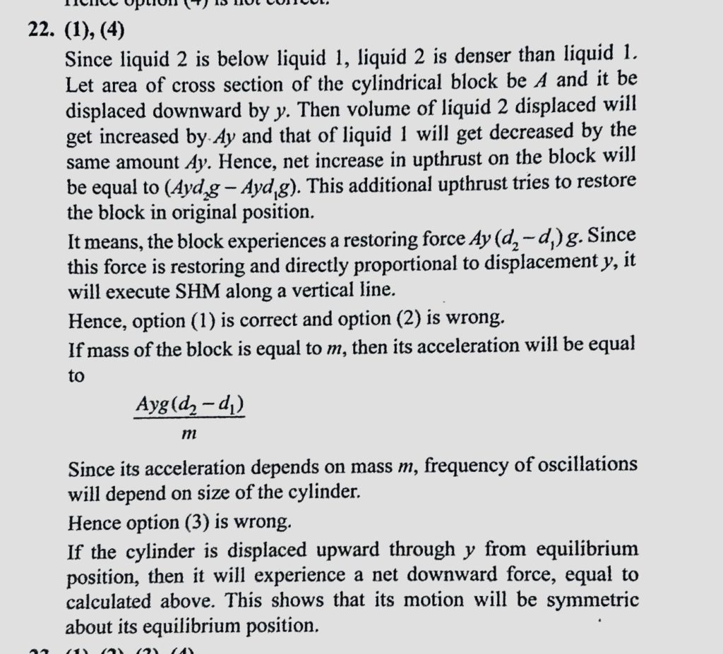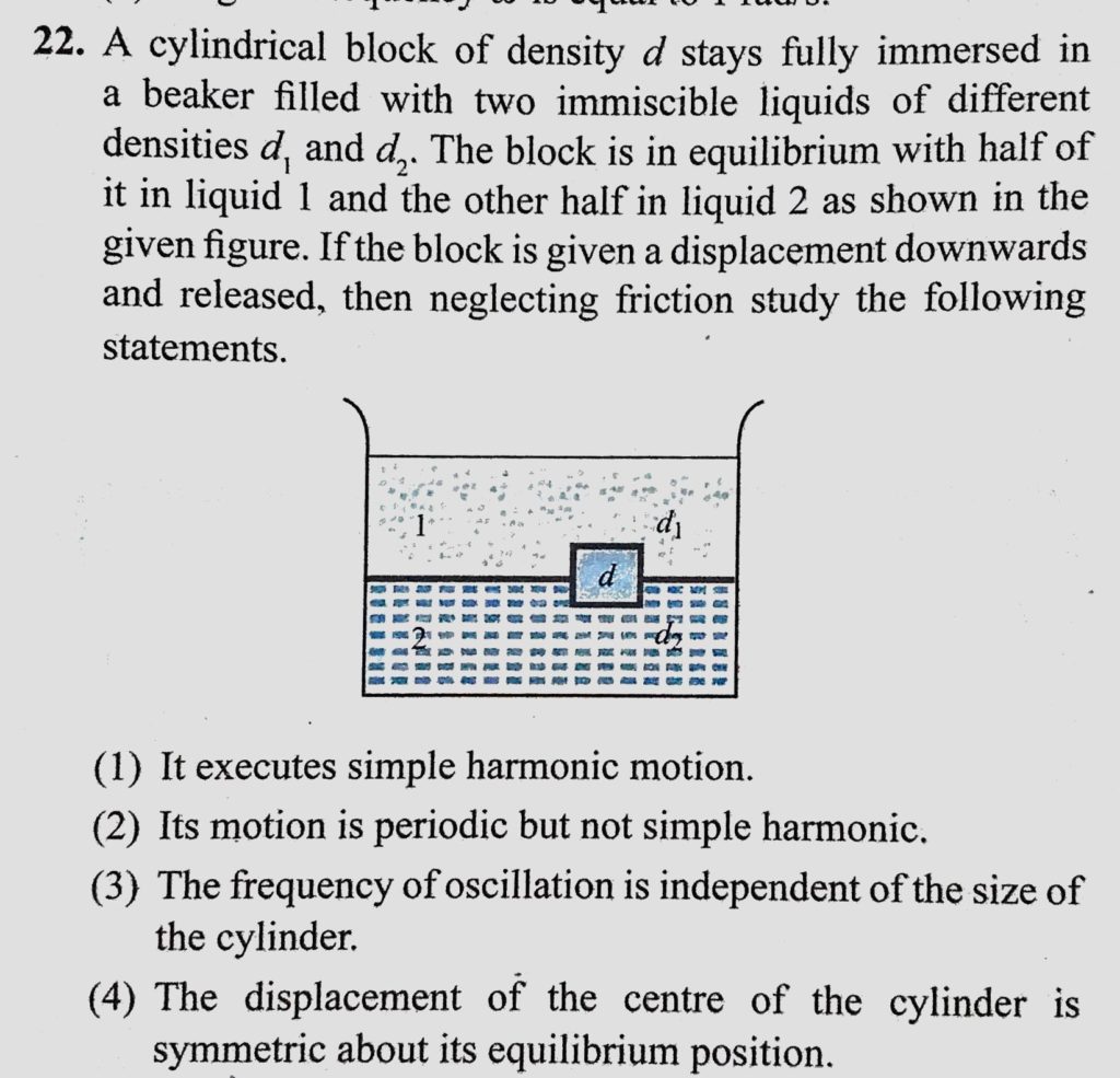 A cylindrical block of density d stays fully immersed in a beaker filled with two immiscible liquids of different densities d1 and d2. The block is in equilibrium with half of it in A cylindrical block of density d stays fully immersed in a beaker filled with two immiscible liquids of different densities d1 and d2. The block is in equilibrium with half of it in October 31, 2020 Category: Uncategorised (JEE Advanced Physics by BM Sharma + GMP Solutions) , Facebook Messenger WhatsApp Share this:TwitterFacebook Related