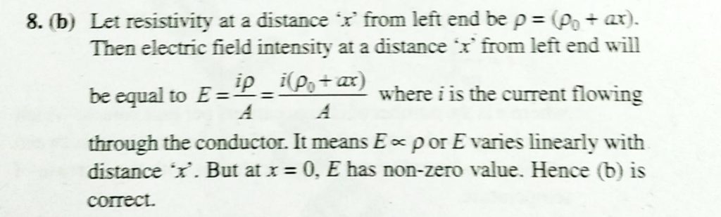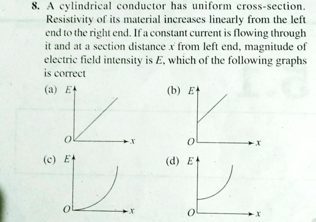A cylindrical conductor has uniform cross-section. Resistivity of its material increase linearly from left end to right end. If a constant current is flowing through it and at a section distance x from left end, magnitude of electric field intensity is E , which of the following graphs is correct