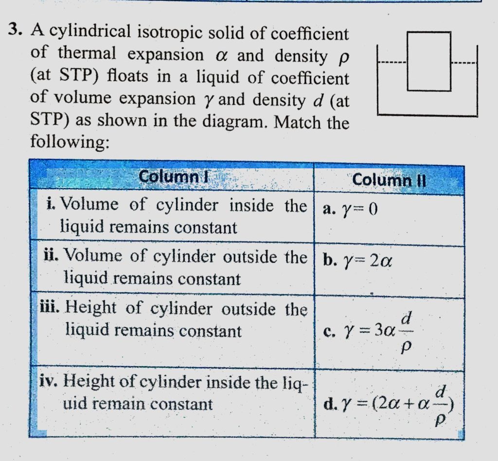 A cylindrical isotropic solid of coefficient of thermal expansion alpha and density rho (at STP) floats in a liquid of coefficient of volume expansion lemda and density d ( at STP) A cylindrical isotropic solid of coefficient of thermal expansion alpha and density rho (at STP) floats in a liquid of coefficient of volume expansion lemda and density d ( at STP) October 24, 2020 Category: Uncategorised (JEE Advanced Physics by BM Sharma + GMP Solutions) , Facebook Messenger WhatsApp Share this:TwitterFacebook Related