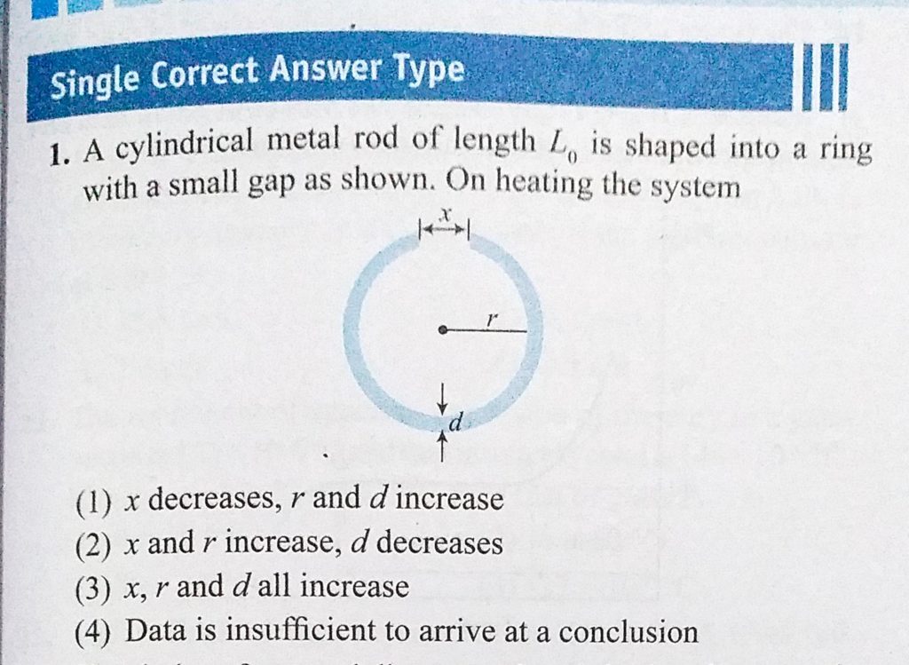 A cylindrical metal rod of length L0 is shaped into a ring with a small gap as shown. On heating the system A cylindrical metal rod of length L0 is shaped into a ring with a small gap as shown. On heating the system October 23, 2020 Category: Uncategorised (JEE Advanced Physics by BM Sharma + GMP Solutions) , Facebook Messenger WhatsApp Share this:TwitterFacebook Related