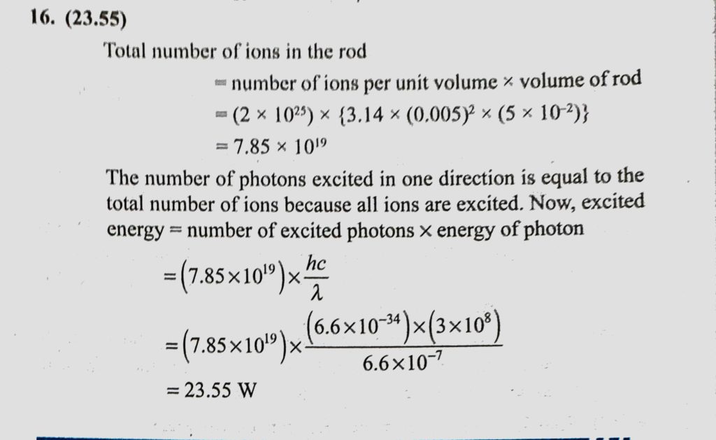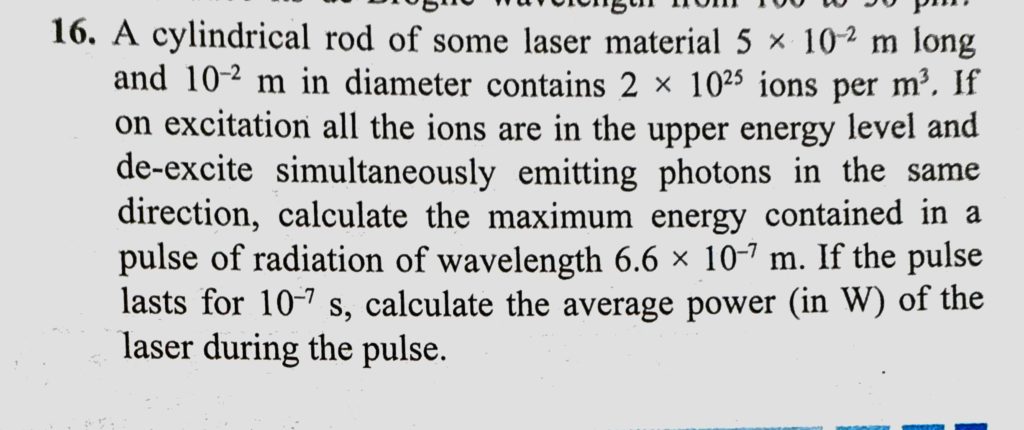 A cylindrical rod of some laser material 5 * 10^-2 m long and 10^-2 m in diameter contains 2 * 10^25 ions per m^3. If on excitation all the ions are in the upper energy level and A cylindrical rod of some laser material 5 * 10^-2 m long and 10^-2 m in diameter contains 2 * 10^25 ions per m^3. If on excitation all the ions are in the upper energy level and October 14, 2020 Category: Uncategorised (JEE Advanced Physics by BM Sharma + GMP Solutions) , Facebook Messenger WhatsApp Share this:TwitterFacebook Related