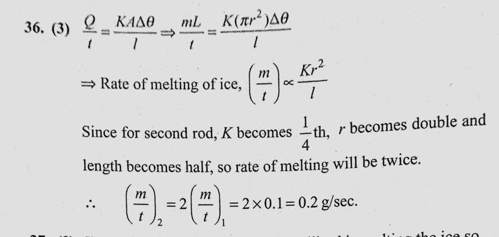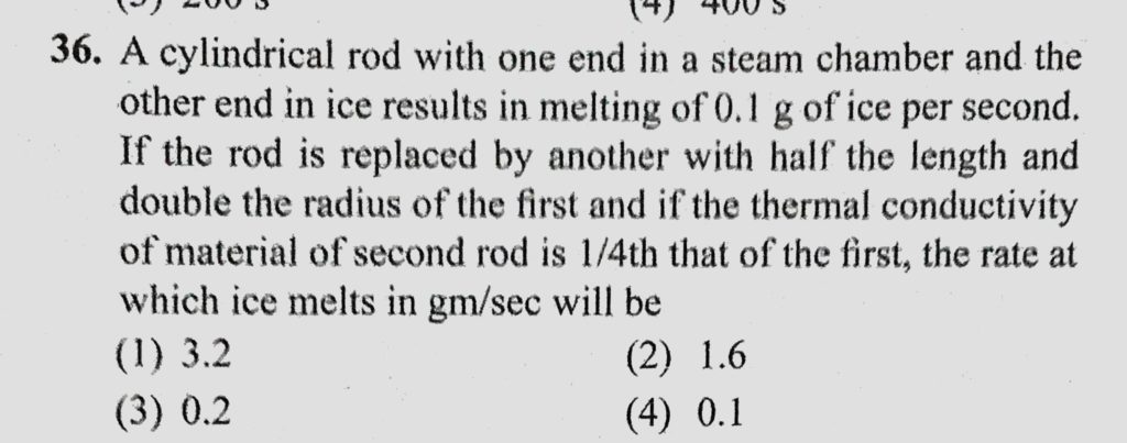A cylindrical rod with one end in a steam chamber and the other end in ice results in melting of 0.1 g of ice per second. If the rod is replaced by another with half the length and A cylindrical rod with one end in a steam chamber and the other end in ice results in melting of 0.1 g of ice per second. If the rod is replaced by another with half the length and October 25, 2020 Category: Uncategorised (JEE Advanced Physics by BM Sharma + GMP Solutions) , Facebook Messenger WhatsApp Share this:TwitterFacebook Related