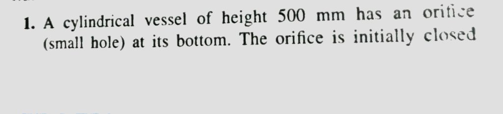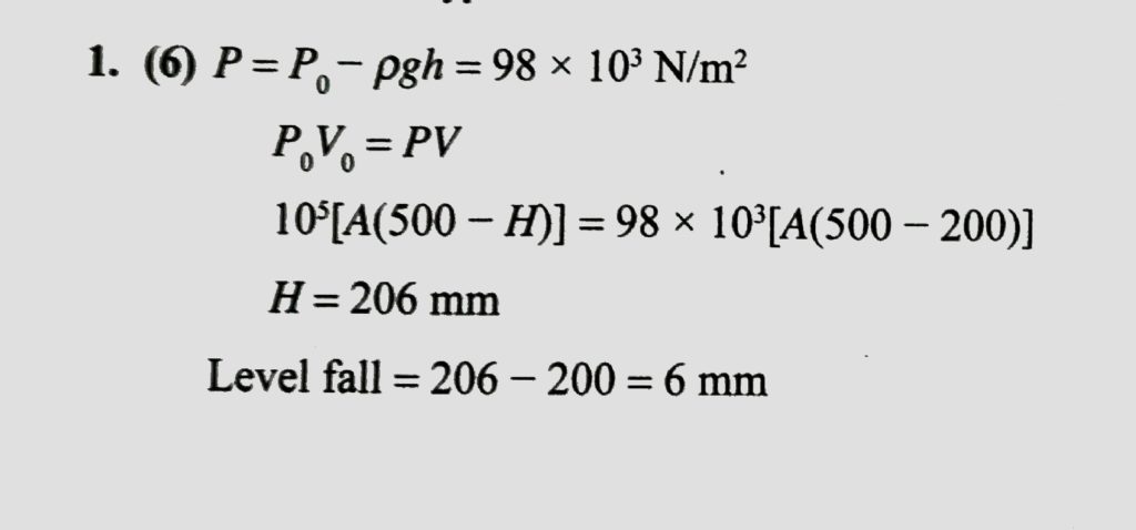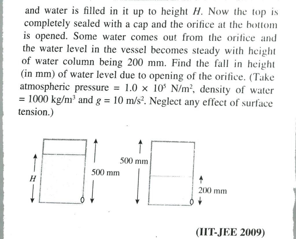 A cylindrical vessel of height 500 mm has an orifice (small hole) at its bottom. The orifice is initially closed and water is filled in it upto height H. Now the top is completely sealed with a cap and the orifice at the bottom is opened. Some water comes out from the orifice and the water level in the vessel becomes steady with the height of water column being 200 mm. Find the fall in height (in mm) of water level due to the opening of the orifice. [Take atmospheric pressure =1.0 × 10 ^ 5 N/m ^ 2 , density of water = 1000 kg/m^3 and g = 10 m/s^ 2 Neglect any effect of surface tension.]