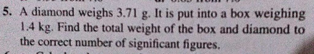 A diamond weighs 3.71 g. It is put into a box weighing 1.4 kg. Find the total weight of the box and diamond to the correct number of significant figures. A diamond weighs 3.71 g. It is put into a box weighing 1.4 kg. Find the total weight of the box and diamond to the correct number of significant figures. September 14, 2020 Category: Uncategorised (JEE Advanced Physics by BM Sharma + GMP Solutions) , Facebook Messenger WhatsApp Share this:TwitterFacebook Related