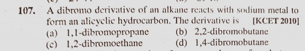 A dibromo derivative of an alkane reacts with sodium metal to form an alicyclic hydrocarbon. The derivative is (a) 1, 1-dibromopropane (b) 2, 2-dibromobutane (c) 1, 2-dibromoethane 1-dibromopropane (b) 2 2-dibromobutane (c) 1 2-dibromoethane A dibromo derivative of an alkane reacts with sodium metal to form an alicyclic hydrocarbon. The derivative is (a) 1 December 13, 2020 Category: Uncategorised (JEE Advanced Physics by BM Sharma + GMP Solutions) , Facebook Messenger WhatsApp Share this:TwitterFacebook Related