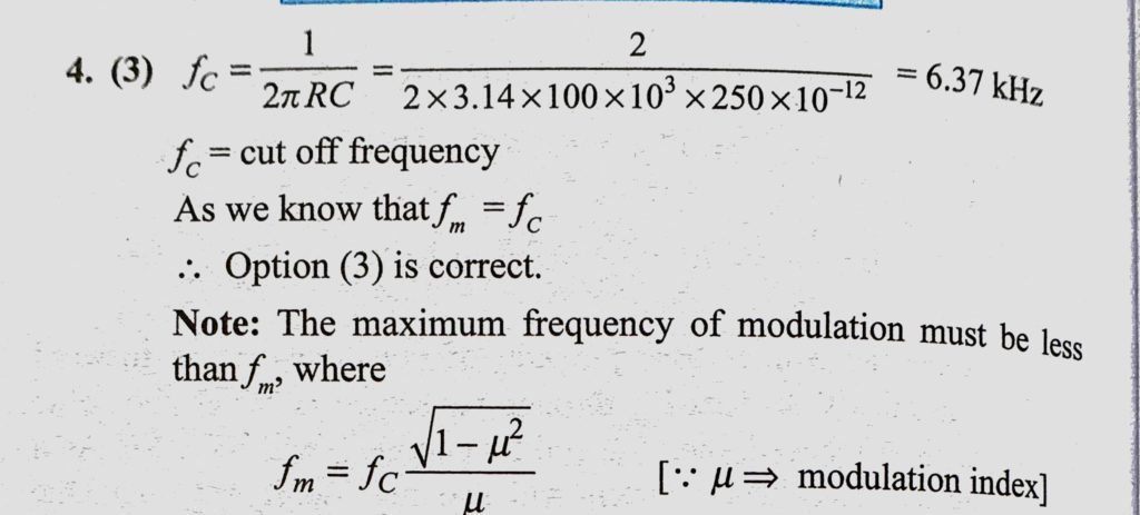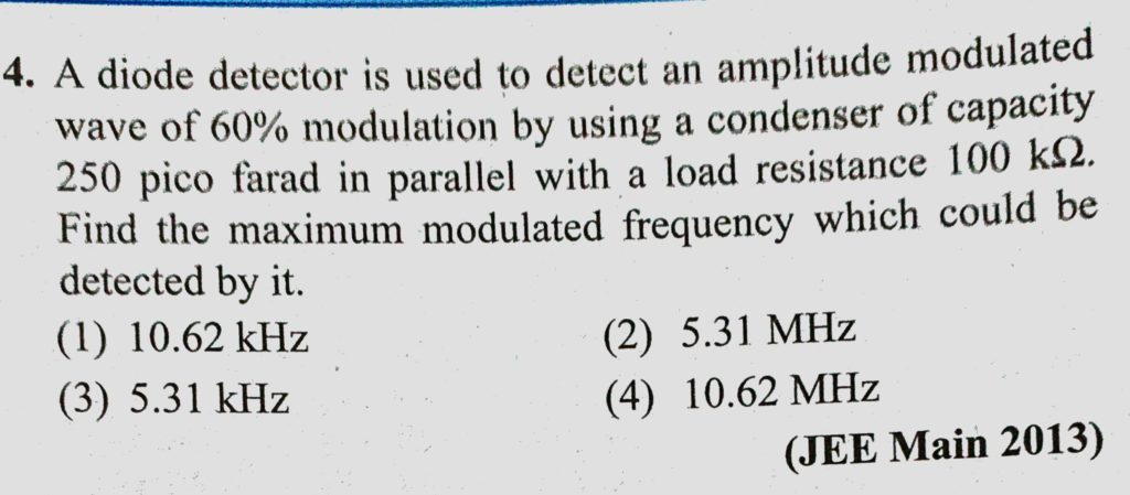 A diode detector is used to detect an amplitude modulated wave of 60% modulation by using a condenser of capacity 250 pico farad in parallel with a load resistance 100 k ohm. A diode detector is used to detect an amplitude modulated wave of 60% modulation by using a condenser of capacity 250 pico farad in parallel with a load resistance 100 k ohm. October 22, 2020 Category: Uncategorised (JEE Advanced Physics by BM Sharma + GMP Solutions) , Facebook Messenger WhatsApp Share this:TwitterFacebook Related