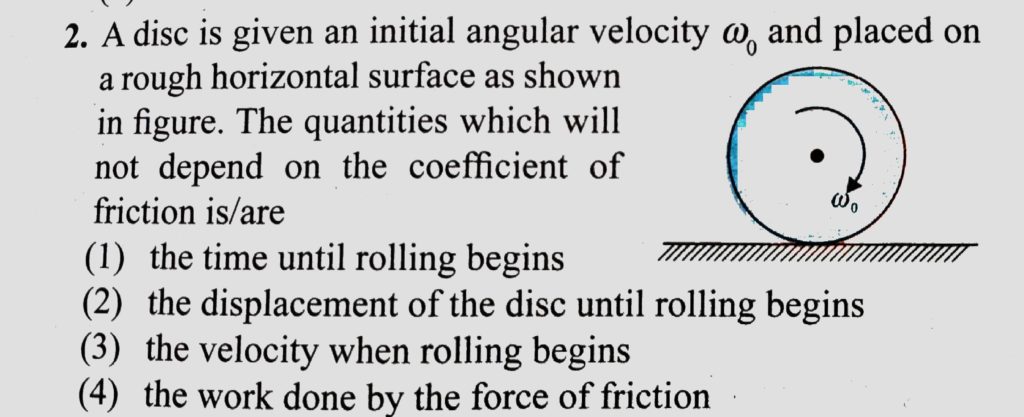 A disc is given an initial angular velocity omega 0 and palced on a rough horizontal surface as shown in figure. The quantities which will not depend on the coefficient of friction is/are A disc is given an initial angular velocity omega 0 and palced on a rough horizontal surface as shown in figure. The quantities which will not depend on the coefficient of friction is/are September 30, 2020 Category: Uncategorised (JEE Advanced Physics by BM Sharma + GMP Solutions) , Facebook Messenger WhatsApp Share this:TwitterFacebook Related