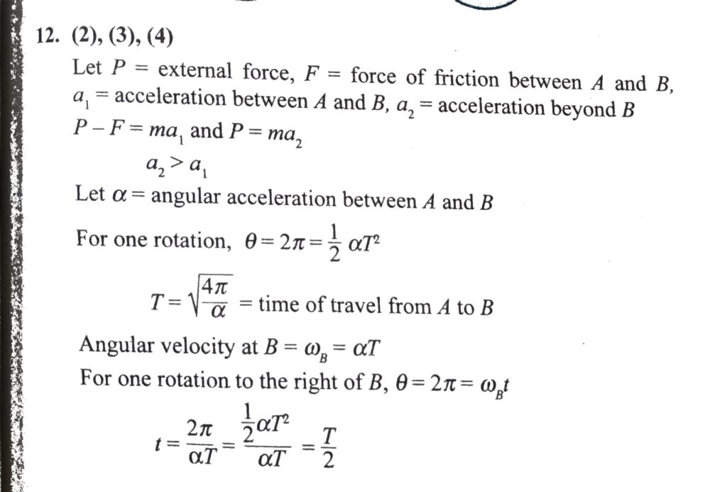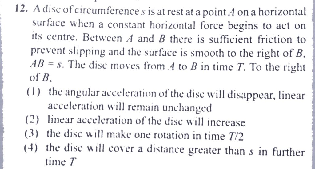 A disc of circumference of s is at rest at a point A on a horizontal surface when a constant horizontal force begins to act on its centre. Between A and B there is sufficient friction to prevent slipping and the surface is smooth to the right of B, AB=s. The disc moves from A to B in time T. To the right of B