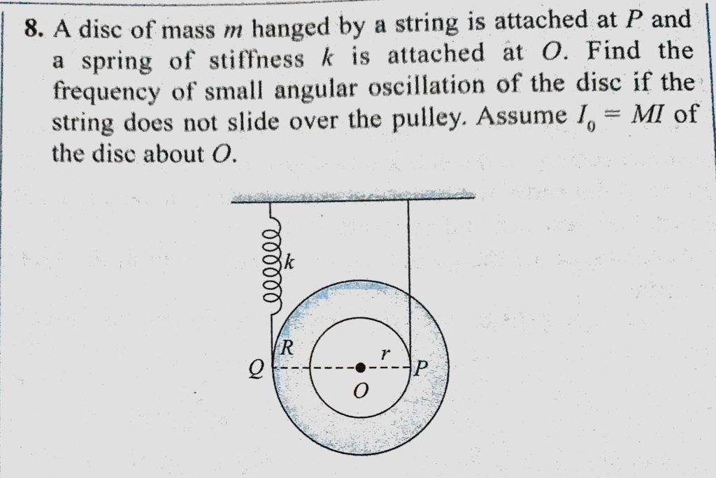 A disc of mass m hanged by a string is attached at P and a spring of stiffness k is attached at O. Find the frequency of small angular oscillation of the disc if the string does not slide A disc of mass m hanged by a string is attached at P and a spring of stiffness k is attached at O. Find the frequency of small angular oscillation of the disc if the string does not slide October 30, 2020 Category: Uncategorised (JEE Advanced Physics by BM Sharma + GMP Solutions) , Facebook Messenger WhatsApp Share this:TwitterFacebook Related