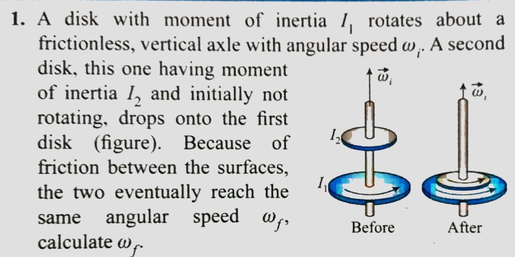 A disk with moment of inertia I1 rotates about a frictionless, vertical axle with angular speed ω i. A second disk, this one having moment of inertia I2 and initially not rotating, drops onto the first disk. Because of friction between the surfaces, the two eventually reach the same angular speed ω f. Calculate ω f.
