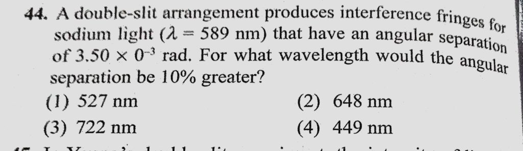 A double-slit arrangement produces interference fringes for sodium light (lemda = 589 nm) that have an angular separation of 3.50 * 0^-3 rad. For what wavelength would the angular A double-slit arrangement produces interference fringes for sodium light (lemda = 589 nm) that have an angular separation of 3.50 * 0^-3 rad. For what wavelength would the angular October 10, 2020 Category: Uncategorised (JEE Advanced Physics by BM Sharma + GMP Solutions) , Facebook Messenger WhatsApp Share this:TwitterFacebook Related