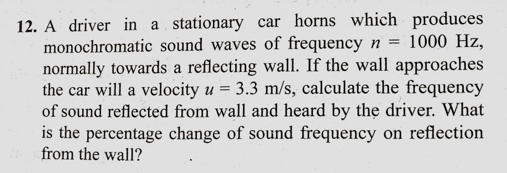 A driver in a stationary car horns which produces monochromatic sound waves of frequency n = 1000 Hz, normally towards a reflecting wall. If the wall approaches the car will A driver in a stationary car horns which produces monochromatic sound waves of frequency n = 1000 Hz normally towards a reflecting wall. If the wall approaches the car will November 8, 2020 Category: Uncategorised (JEE Advanced Physics by BM Sharma + GMP Solutions) , Facebook Messenger WhatsApp Share this:TwitterFacebook Related