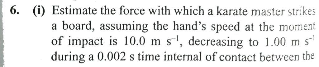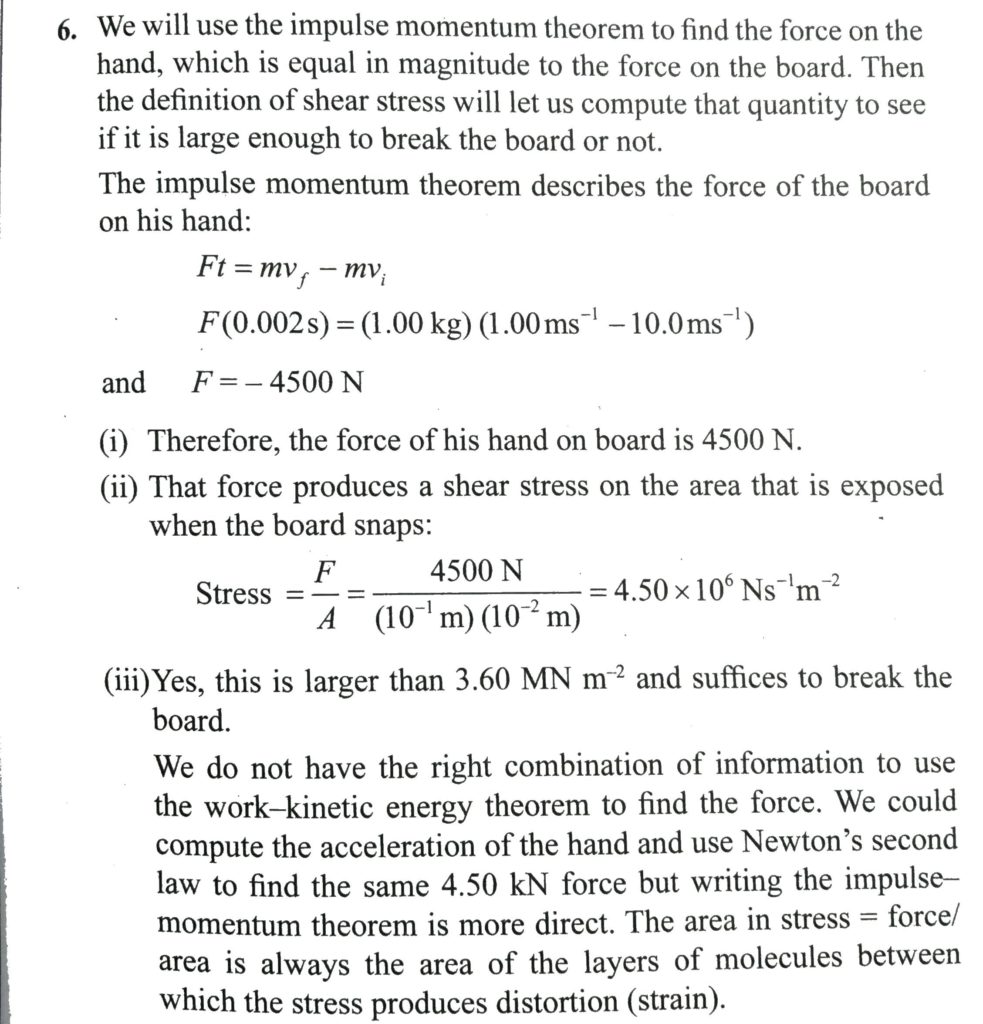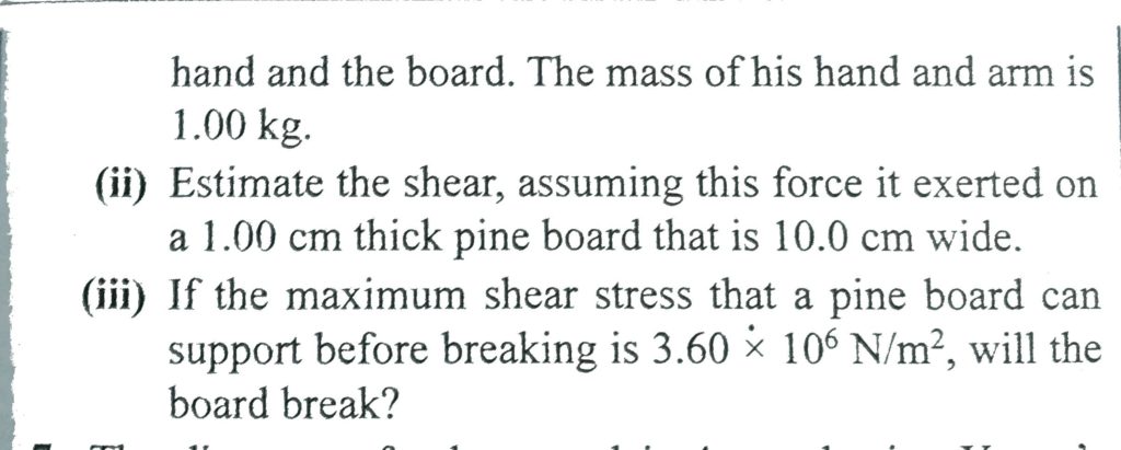 a. Estimate the force with which a karate master strikes a board, assuming the hand’s speed at the moment of impact is 10.0 m/s, decreasing to 1.00 m/s during a 0.002 s time internal of contact between te hand and the board. The mass of his and and arm is 1.00 kg . b Estimate the shear, assuming this force it exerted on a 1.00 cm thick pine board that is 10.0 m wide. c. If we maximum shear stress a pine board can support before breaking is 3.60 × 10^6 N/m^2, will the board break?