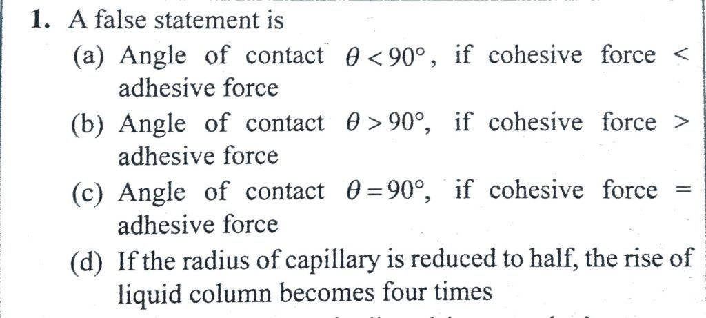 A false statement is (a) Angle of contact theta < 90 degree, if cohesive force < adhesive force A false statement is (a) Angle of contact theta < 90 degree if cohesive force < adhesive force October 11, 2020 Category: Uncategorised (JEE Advanced Physics by BM Sharma + GMP Solutions) , Facebook Messenger WhatsApp Share this:TwitterFacebook Related