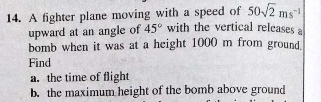 A fighter plane moving with a speed of 50 root 2 m/s upward at an angle of 45 with the vertical releases a bomb when it was at a height 1000 m from ground. Find a. the time of flight b. the maximum A fighter plane moving with a speed of 50 root 2 m/s upward at an angle of 45 with the vertical releases a bomb when it was at a height 1000 m from ground. Find a. the time of flight b. the maximum September 21, 2020 Category: Uncategorised (JEE Advanced Physics by BM Sharma + GMP Solutions) , Facebook Messenger WhatsApp Share this:TwitterFacebook Related