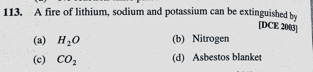 A fire of lithium, sodium and potassium can be extinguished by (a) H2O (b) Nitrogen (c) CO2 (d) Asbestos blanket A fire of lithium sodium and potassium can be extinguished by (a) H2O (b) Nitrogen (c) CO2 (d) Asbestos blanket November 15, 2020 Category: Uncategorised (JEE Advanced Physics by BM Sharma + GMP Solutions) , Facebook Messenger WhatsApp Share this:TwitterFacebook Related