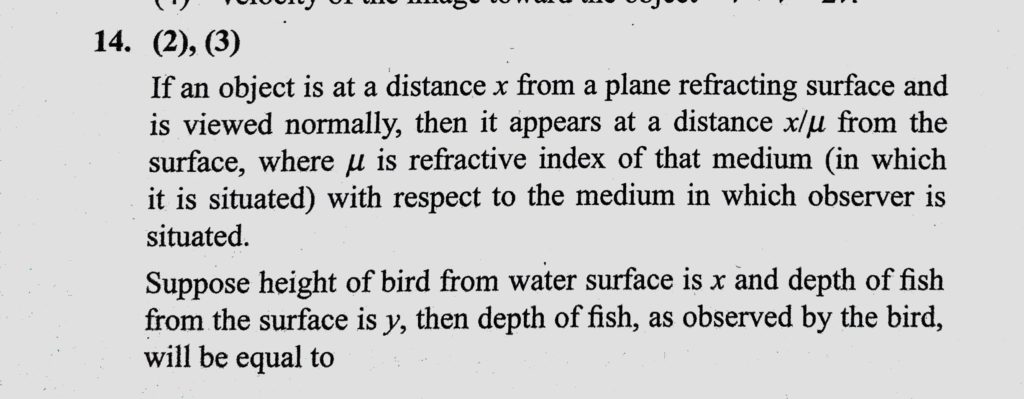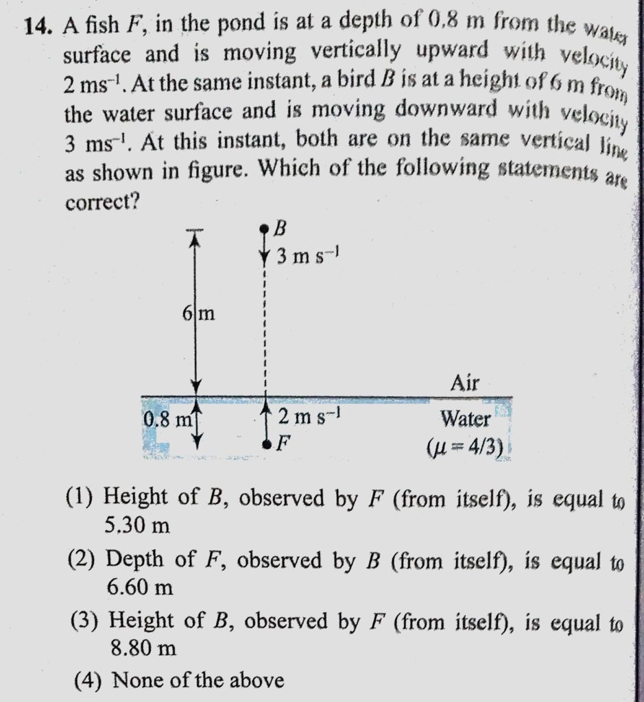 A fish F, in the pond is at a depth of 0.8 m from the water surface and is moving vertically upward with velocity 2 m/s. At the same instant, a bird B is at a height of 6 m from the water surface a bird B is at a height of 6 m from the water surface A fish F in the pond is at a depth of 0.8 m from the water surface and is moving vertically upward with velocity 2 m/s. At the same instant October 6, 2020 Category: Uncategorised (JEE Advanced Physics by BM Sharma + GMP Solutions) , Facebook Messenger WhatsApp Share this:TwitterFacebook Related