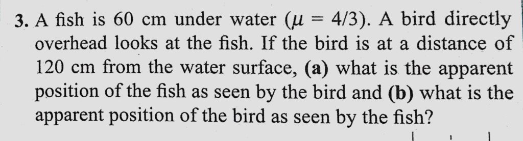 A fish is 60 cm under water (mu = 4/3). A bird directly overhead looks at the fish. If the bird is at a distance of 120 cm from the water surface, (a) what is the apparent position of the fish as seen by the bird and (a) what is the apparent position of the fish as seen by the bird and A fish is 60 cm under water (mu = 4/3). A bird directly overhead looks at the fish. If the bird is at a distance of 120 cm from the water surface October 5, 2020 Category: Uncategorised (JEE Advanced Physics by BM Sharma + GMP Solutions) , Facebook Messenger WhatsApp Share this:TwitterFacebook Related