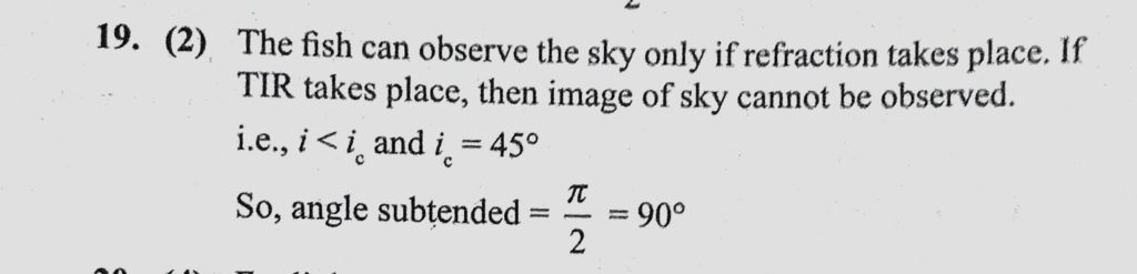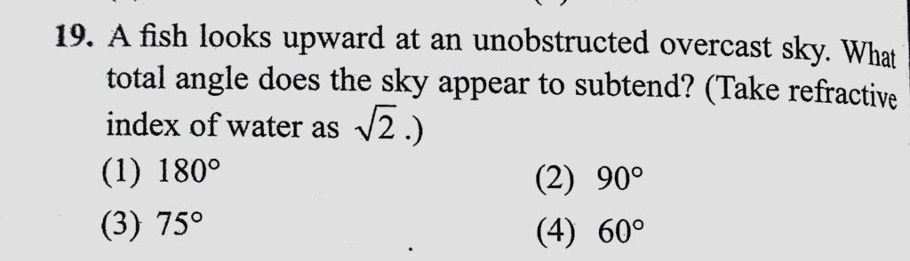 A fish looks upward at an unobstructed overcast sky. What total angle does the sky appear to subtend? A fish looks upward at an unobstructed overcast sky. What total angle does the sky appear to subtend? October 6, 2020 Category: Uncategorised (JEE Advanced Physics by BM Sharma + GMP Solutions) , Facebook Messenger WhatsApp Share this:TwitterFacebook Related