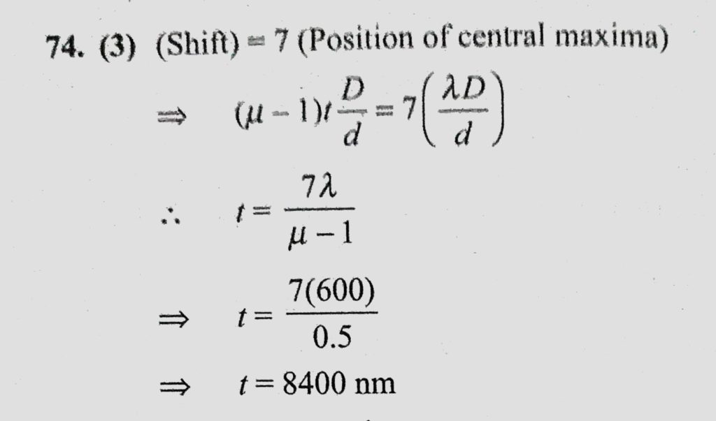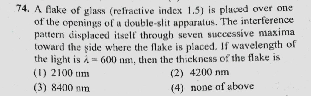A flake of glass (refractive index 1.5) is placed over one of the openings of a double-slit apparatus. The interference pattern displaced itself through seven successive maxima toward A flake of glass (refractive index 1.5) is placed over one of the openings of a double-slit apparatus. The interference pattern displaced itself through seven successive maxima toward October 10, 2020 Category: Uncategorised (JEE Advanced Physics by BM Sharma + GMP Solutions) , Facebook Messenger WhatsApp Share this:TwitterFacebook Related