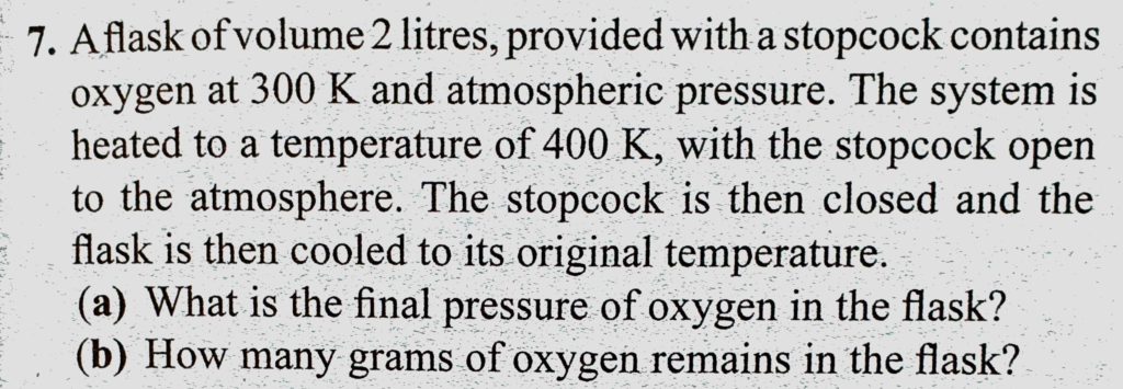 A flask of volume 2 litres, provided with a stopcock contains oxygen at 300 K and atmospheric pressure. The system is heated to a temperature of 400 K, with the stopcock open A flask of volume 2 litres provided with a stopcock contains oxygen at 300 K and atmospheric pressure. The system is heated to a temperature of 400 K with the stopcock open October 27, 2020 Category: Uncategorised (JEE Advanced Physics by BM Sharma + GMP Solutions) , Facebook Messenger WhatsApp Share this:TwitterFacebook Related
