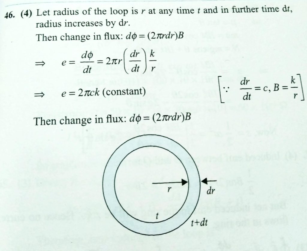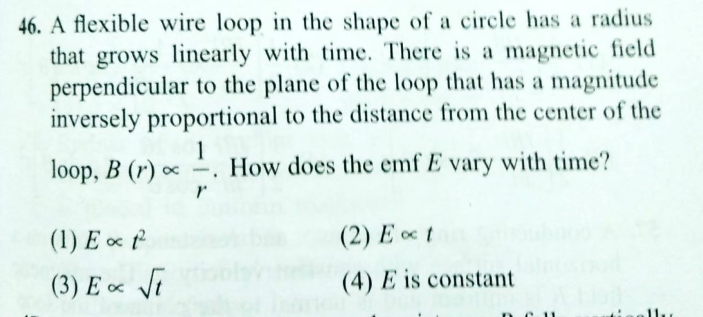 A flexible wire loop in the shape of a circle has a radius that grows linearly with time. There is a magnetic field perpendicular to the plane of the loop that has a magnitude inversely proportional to the distance from the centre of the loop, B(r)∝1/r How does the emf E vary with time?