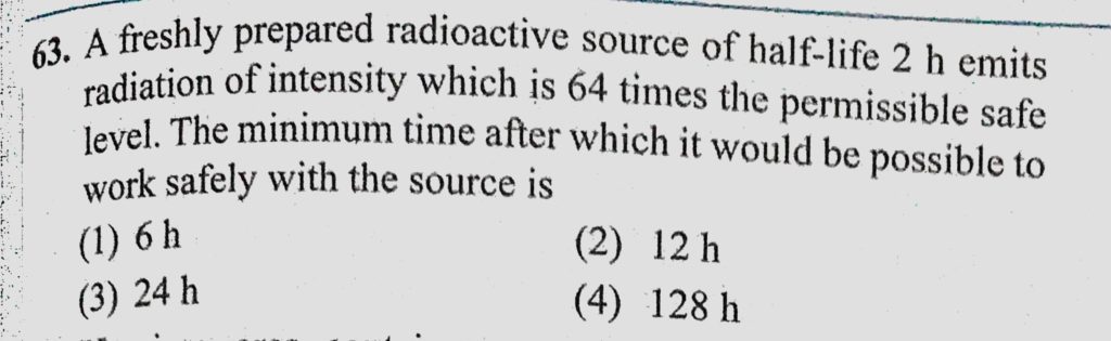 A freshly prepared radioactive source of half-life 2 h emits radiation of intensity which is 64 times the permissible safe level. The minimum time after which it would be possible to A freshly prepared radioactive source of half-life 2 h emits radiation of intensity which is 64 times the permissible safe level. The minimum time after which it would be possible to October 18, 2020 Category: Uncategorised (JEE Advanced Physics by BM Sharma + GMP Solutions) , Facebook Messenger WhatsApp Share this:TwitterFacebook Related